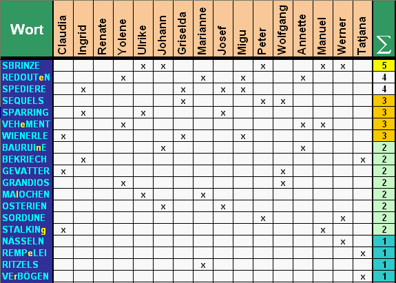 30.01. REDOUTeN (Johann) 06.02. ??????? (Claudia) 20.02. GEVATTER (Marianne) 27.02. KAuSCHE (Ulrike) 06.03. BEKRIECH (Johann) 13.03. VEHeMENT (Manuel) 20.03. ROLLIGEN (Claudia) 27.03. SPEDIERE (Renate,Josef) 10.04. REMPeLEI (Sonja) 24.04. NÄSSELN (Ulrike) 08.05. BEREDTEs (Johann) 15.05. SORDUNE (Johann) 26.06. SCHINDER (Wolfgang) 03.07. GRANDIOS (Ingrid) 25.07. RITZELS (Griselda) 31.07. STALKINg (Ulrike) 07.08. RÜLPSEN (Claudia) 14.08. OSTERIEN (Ulrike) 21.08. SPARRING (Wolfgang) 28.08. xxxxxxx (xxxxxxxx) 04.09. yyyyyyy (yyyyyyy) 11.09. GEWILLTe (Johann) 18.09. SPALIER (Peter) ... 23.10. BAURUInE (Claudia) 30.10. WIENERLE (Manuel) 20.11. MAlOCHEN (Renate) 27.11. SEQUELS (Ulrike) 04.12. SBRINZE (Claudia) 11.12. KRÜPpEL (Ingrid) 18.12. VErBÖGEN (Peter) | ||