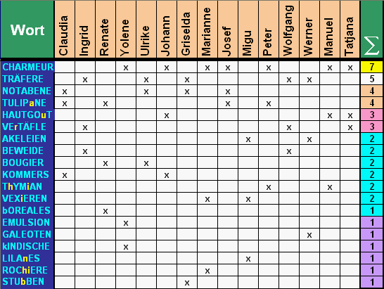 15.01. EINBÜSSE (Marianne) 22.01. ThYMiAN (Claudia) 05.02. TRÄFERE (Ulrike) 12.02. VErTÄFLE (Johann) 19.02. GALEOTEN (Claudia) 26.02. LILAnES (Claudia) 12.03. GROBIaNS (Johann) 19.03. LUNCHET (Werner) 26.03. BOUGIER (Peter) 02.04. NOTABENE (Migu) 09.04. MÜHSALE (Johann) 16.04. HAUTGOuT (Claudia) 23.04. TULIPaNE (Johann) 30.04. --------- (--------) 07.05. KOMMERS (Werner) 14.05. GARNISON (Claudia) 21.05. VEXIERE (Johann) 4.06. --------- (--------)11.06. --------- (--------) 18.06. --------- (--------) 02.07. bOREALES (Manuel) 18.06. --------- (--------) 08.08. VEXiEREN (Johann) 13.08. --------- (--------) 20.08. ROChiERE (Renate) 03.09. STUbBEN (Marianne) 24.09. --------- (--------) 01.10. --------- (--------) 15.10. --------- (--------) 22.10. ERGRIMMe (Renate) 29.10. CHARMEUR (Ulrike) 05.11. JUXEnDES (Marianne) 12.11. kINDISCHE (Johann) 19.11. AKELEIEN (Peter) 26.11. --------- (--------) 03.12. TÖPFERS (Peter) 10.12. --------- (--------) 17.12. BEWEIDE (Werner) 28.12. EMULSION (Wolfgang) | ||