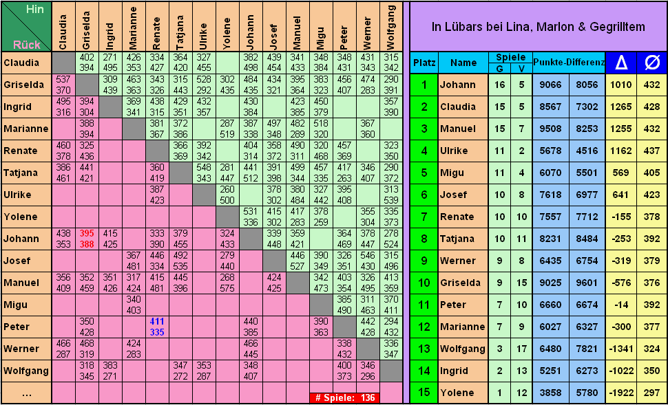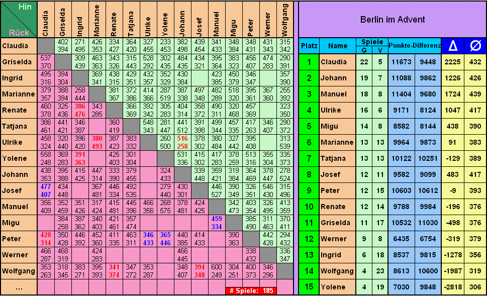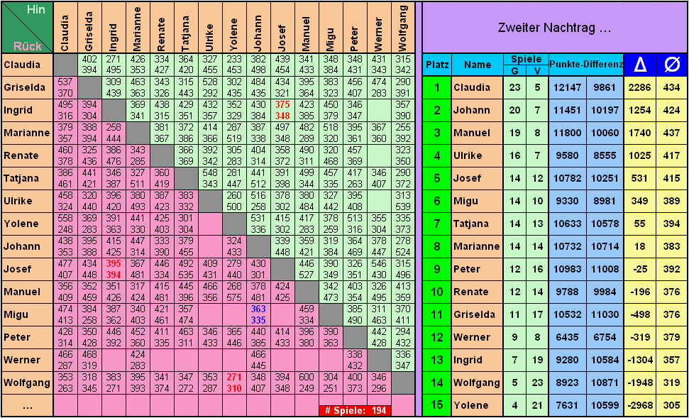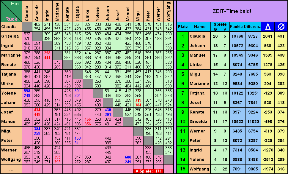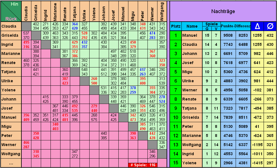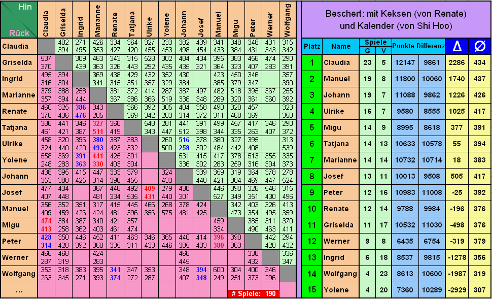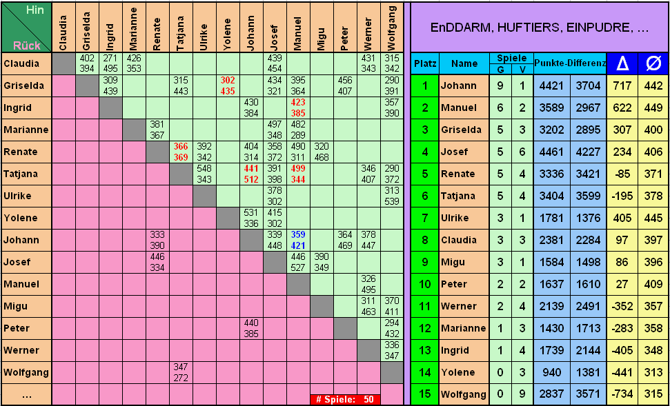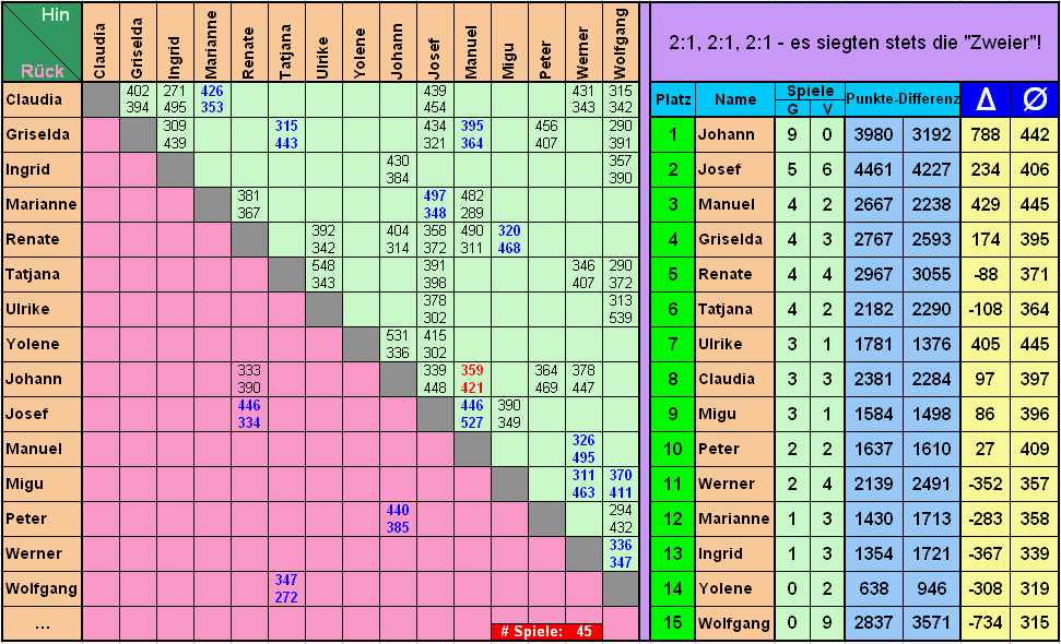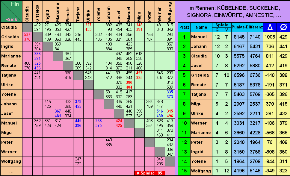 | Hinweise zum Lesen der Ergebnistabelle: Die Hinrunde ist im rechten oberen Teil der Tabelle abgebildet, die Rückrunde im linken unteren (rosa Hintergrund). Der obere Punktwert in einem Ergebnisfeld entspricht dem Spielernamen auf der Waagerechten(Abszisse), der untere dem Spielernamen auf der Senkrechten (Ordinate). Beispiel: In der Hinrunde gewann Renate gegen Josef mit 372:358 Punkten Die Ergebnisse der letzten Runde sind rot, jene der vorletzten blau eingefärbt. | ||
