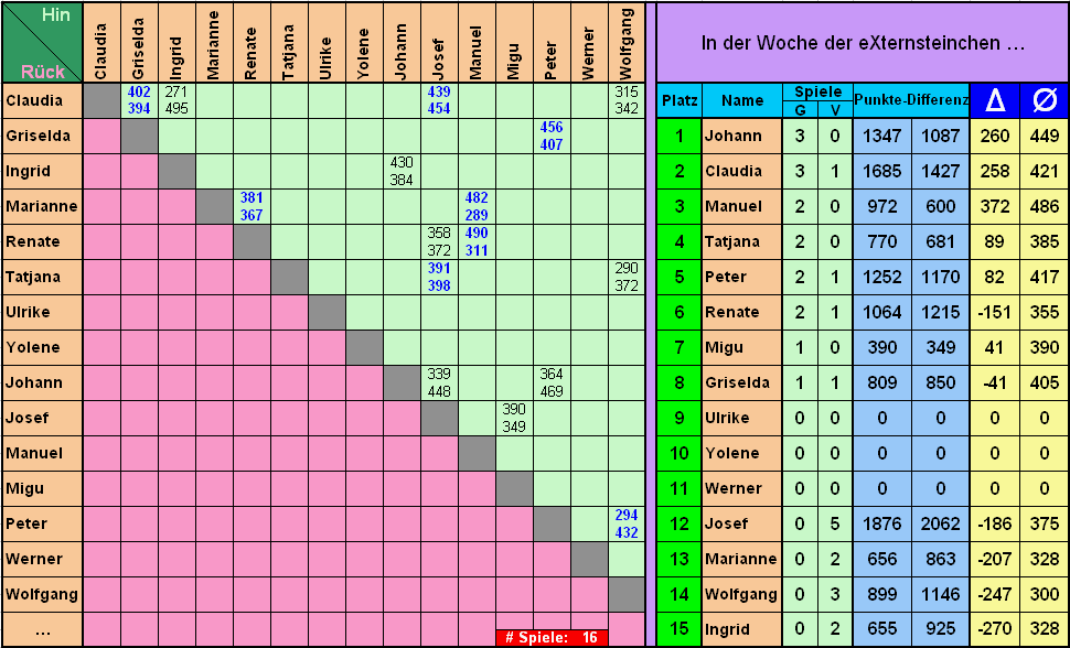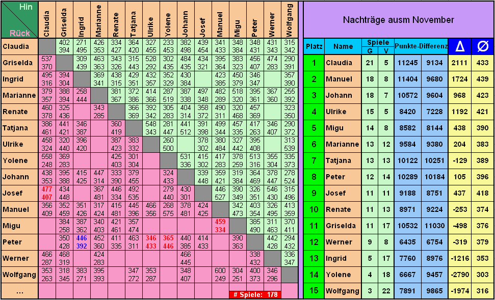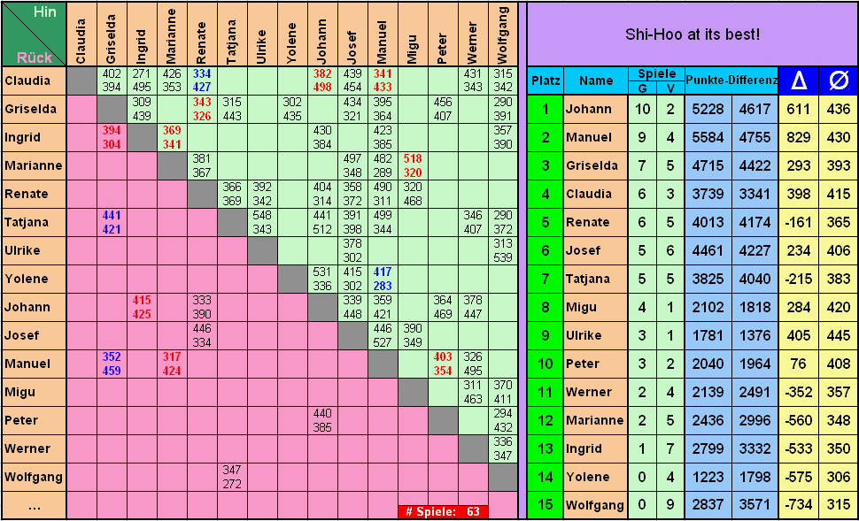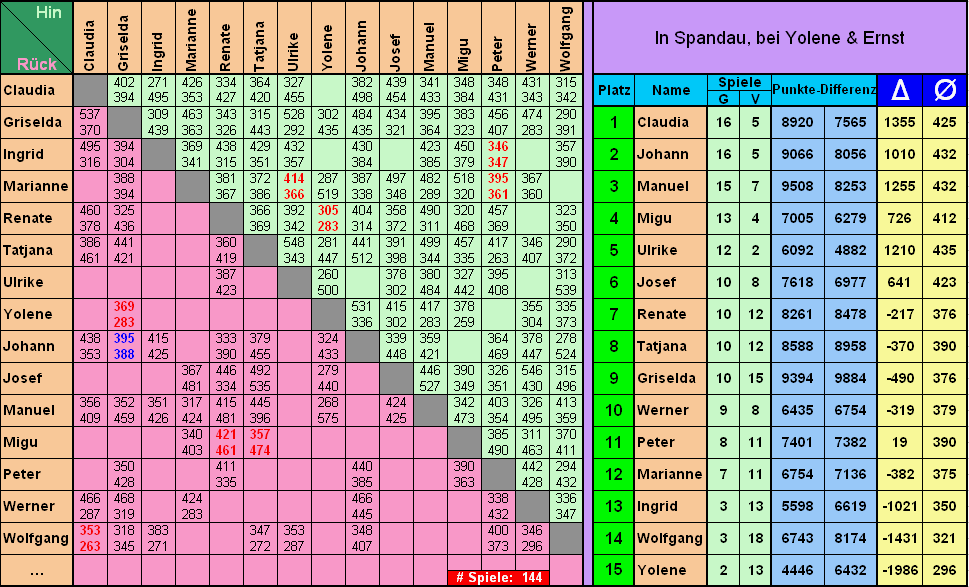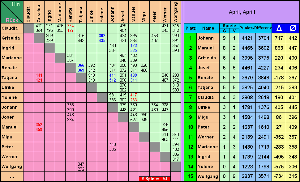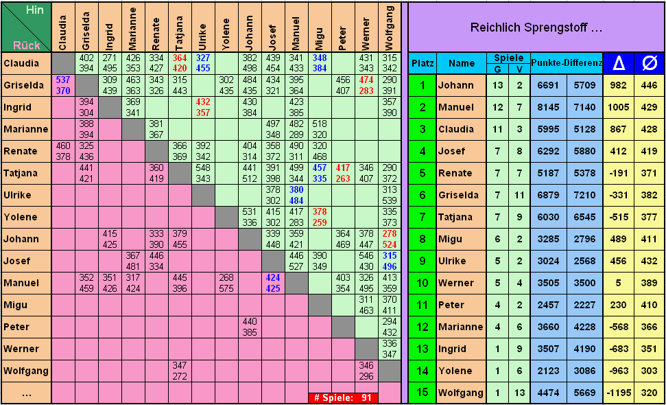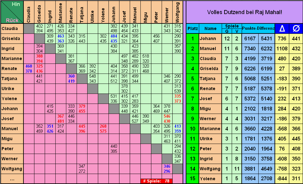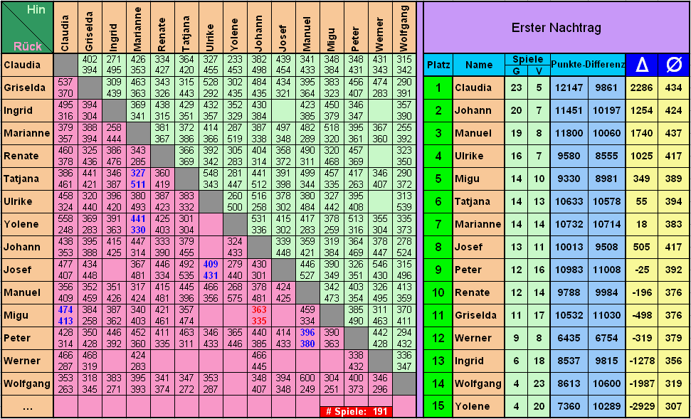 | Hinweise zum Lesen der Ergebnistabelle: Die Hinrunde ist im rechten oberen Teil der Tabelle abgebildet, die Rückrunde im linken unteren (rosa Hintergrund). Der obere Punktwert in einem Ergebnisfeld entspricht dem Spielernamen auf der Waagerechten(Abszisse), der untere dem Spielernamen auf der Senkrechten (Ordinate). Beispiel: In der Hinrunde gewann Renate gegen Josef mit 372:358 Punkten Die Ergebnisse der letzten Runde sind rot, jene der vorletzten blau eingefärbt. | ||