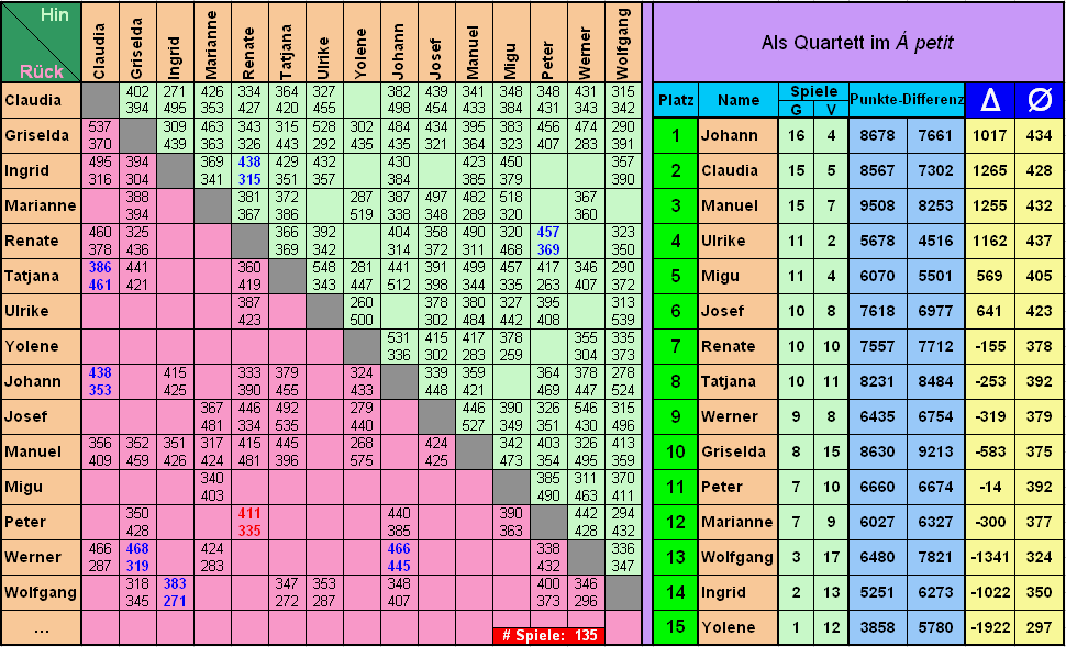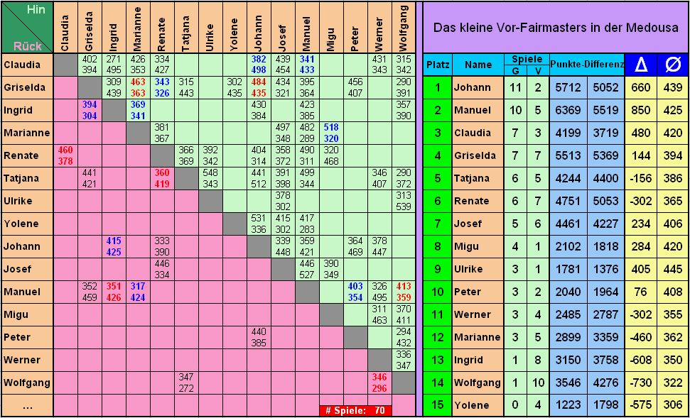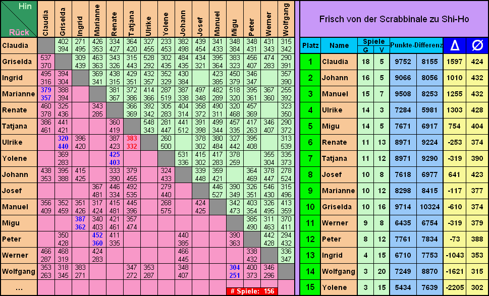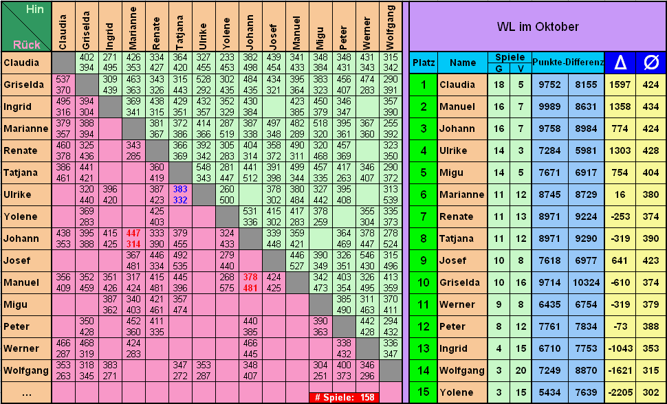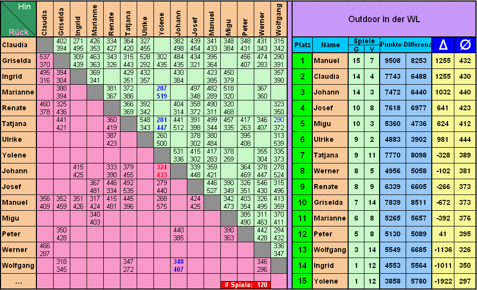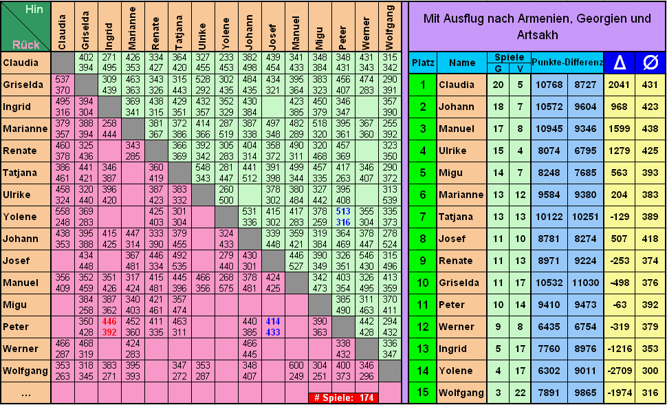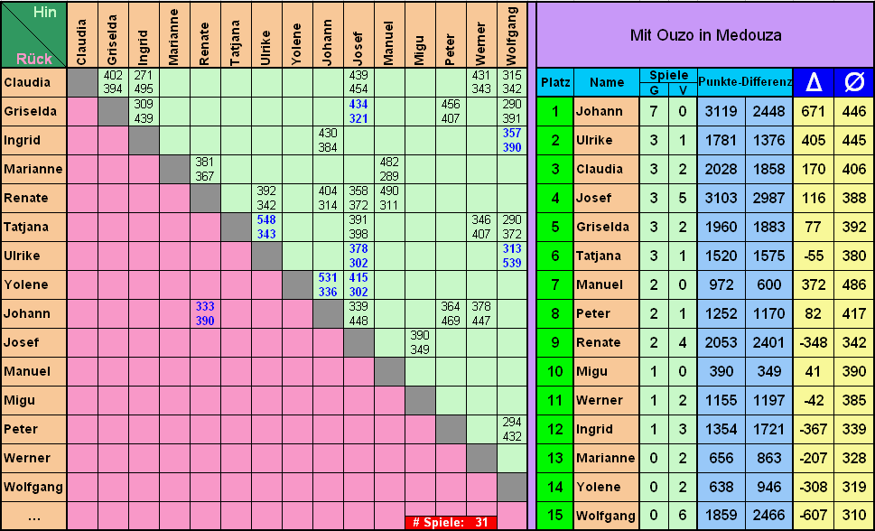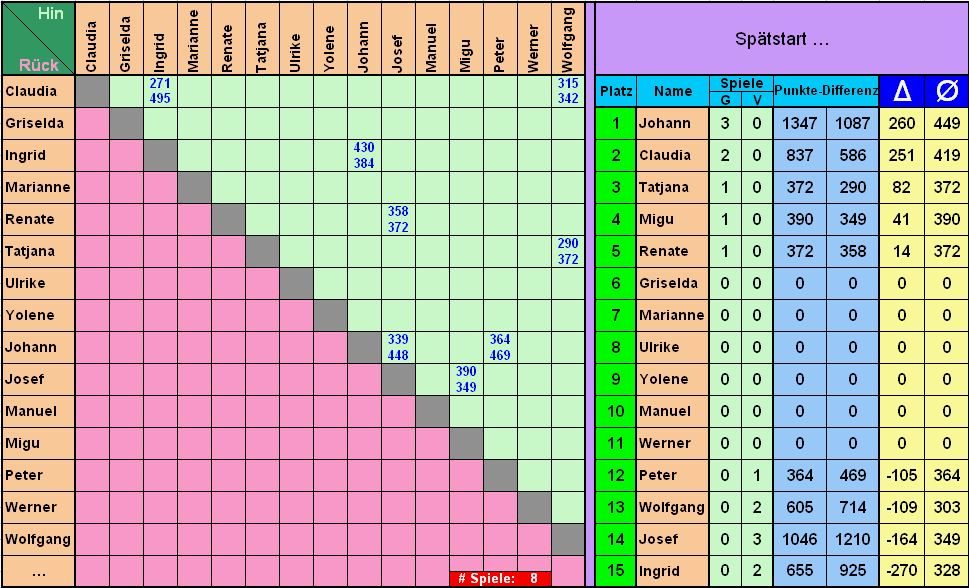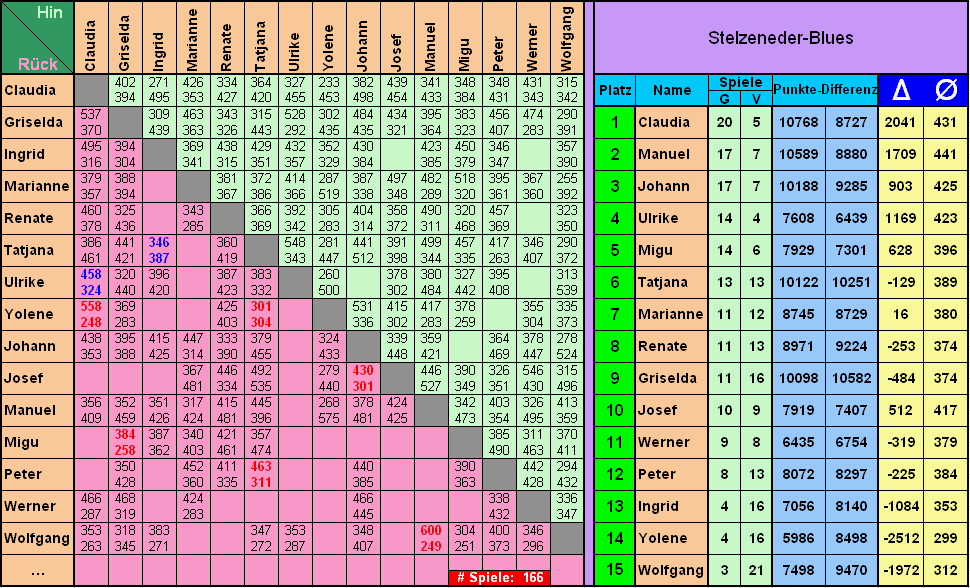 | Hinweise zum Lesen der Ergebnistabelle: Die Hinrunde ist im rechten oberen Teil der Tabelle abgebildet, die Rückrunde im linken unteren (rosa Hintergrund). Der obere Punktwert in einem Ergebnisfeld entspricht dem Spielernamen auf der Waagerechten(Abszisse), der untere dem Spielernamen auf der Senkrechten (Ordinate). Beispiel: In der Hinrunde gewann Renate gegen Josef mit 372:358 Punkten Die Ergebnisse der letzten Runde sind rot, jene der vorletzten blau eingefärbt. | ||