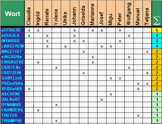 07.01. PROmISKe (Claudia) 14.01. EXISTENz (Ulrike) 21.01. ------- (-------) 28.01. ANGEFIXT (Ulrike) 04.02. ASCHENE (Renate) 11.02. ------- (-------) 18.02. oUTRIERE (Renate) 25.02. eINGRÜBe (Ingrid) 04.03. ------- (-------) 11.03. ------- (-------) 25.03. FROTZElN (Tatjana) 01.04. DALKeRT (Peter & Johann) 08.04. KURIoSEN (Ingrid) 22.04. bOUGIES (Peter) 29.04. GOBELInS (Johann) 06.05. INTARSIE (Migu) 20.05. DYNAMItS (Sonja) 27.05. ------- (-------) 03.06. ------- (-------) 10.06. ------- (-------) 17.06. ------- (-------) 24.06. ------- (-------) 01.07. ------- (-------) 15.07. TRIUMPHE (Oliver) 22.07. LARGEREM (Claudia) 29.07. ------- (-------) 05.08. ------- (-------) 26.08. ------- (-------) 02.09. EINSÄUERE (Ulrike) 09.09. ANBRÄTST (Renate) 23.09. ------- (-------) 07.10. ------- (-------) 21.10. ------- (-------) 28.10. TINiTUS (Claudia) 04.11. EINHAUCHE (Johann) 11.11. ------- (-------) 18.11. FAHNDERS (Marianne) 02.12. ------- (-------) 09.12. ------- (-------) 16.12. SEQUoIAS (Johann) 06.01.16 GEZACKTe(Ulrike) 13.01.16 ------- (-------) | ||
