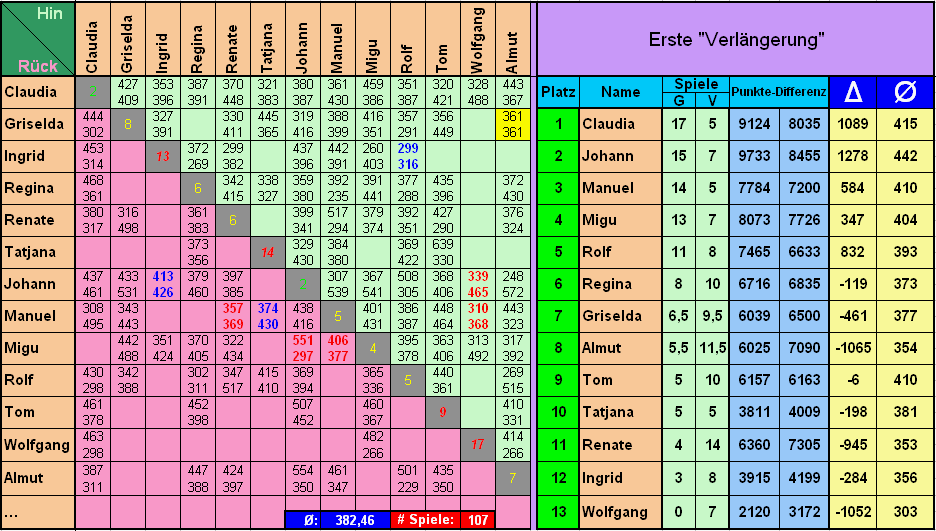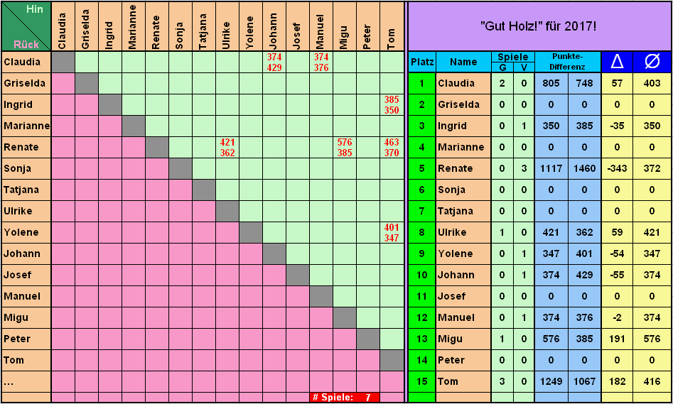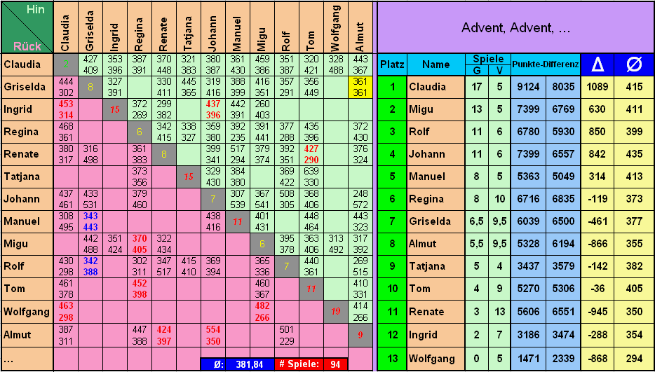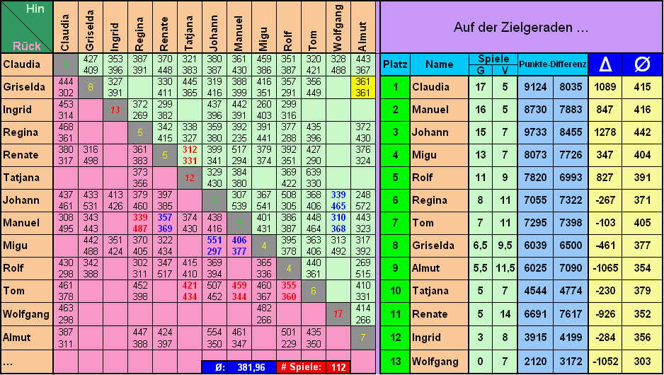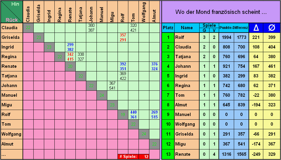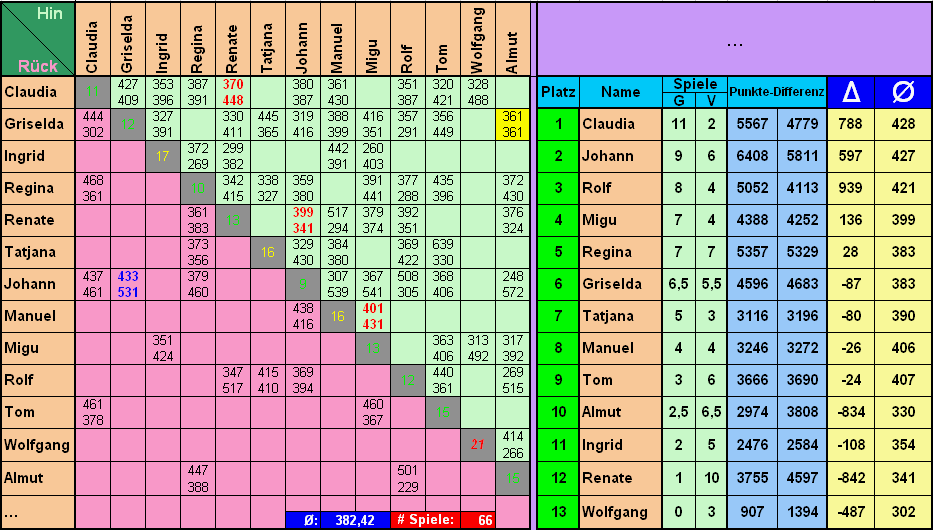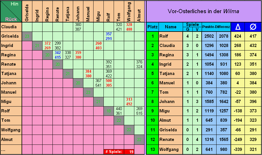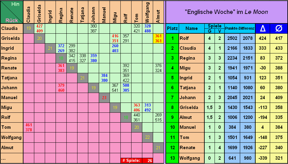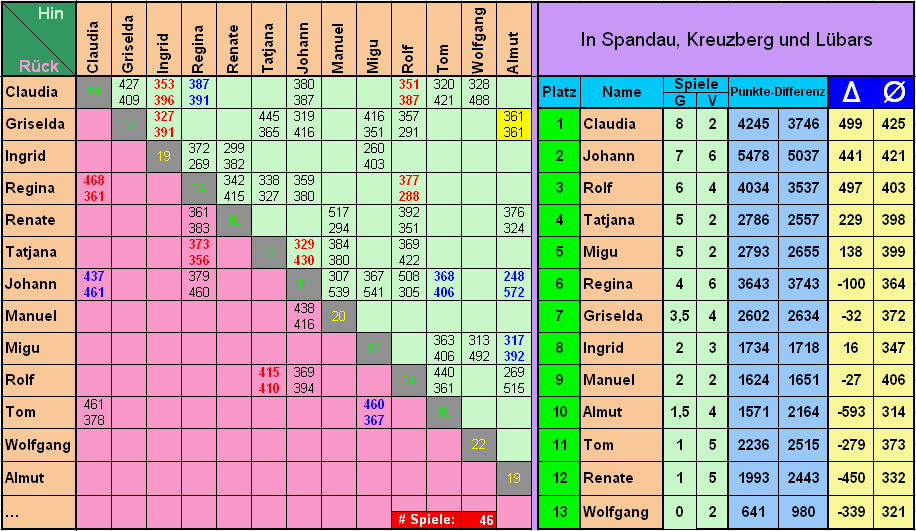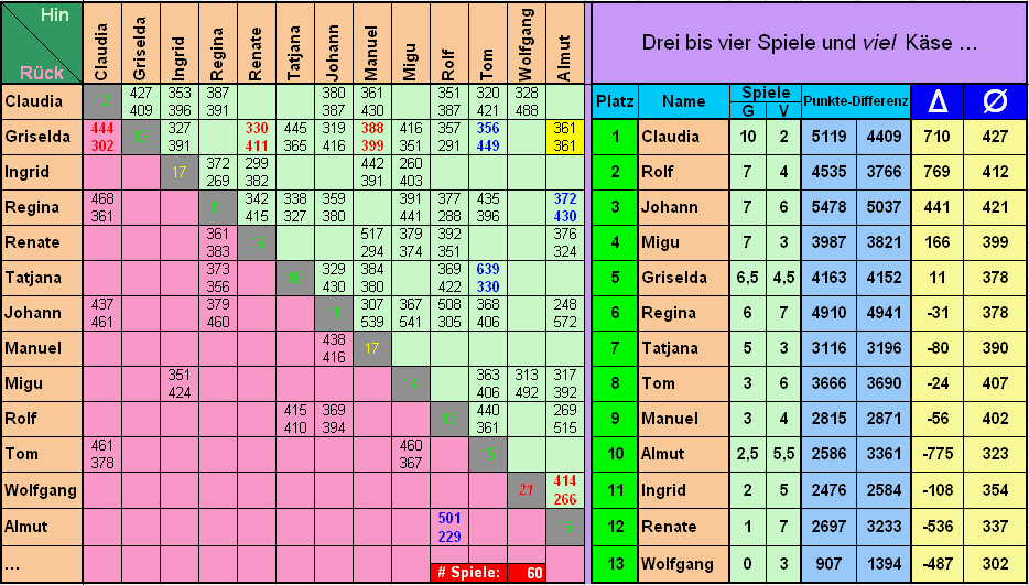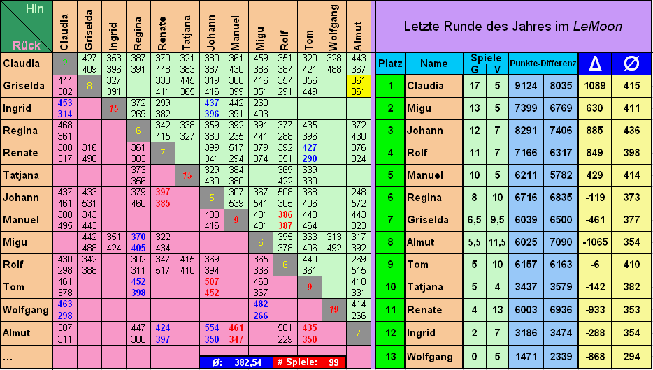 | Hinweise zum Lesen der Ergebnistabelle: Die Hinrunde ist im rechten oberen Teil der Tabelle abgebildet, die Rückrunde im linken unteren (rosa Hintergrund). Der obere Punktwert in einem Ergebnisfeld entspricht dem Spielernamen auf der Waagerechten(Abszisse), der untere dem Spielernamen auf der Senkrechten (Ordinate). Beispiel: In der Hinrunde gewann Claudia gegen Johann mit 387:380 Punkten. Die Ergebnisse der letzten Runde sind rot, jene der vorletzten blau eingefärbt. | ||