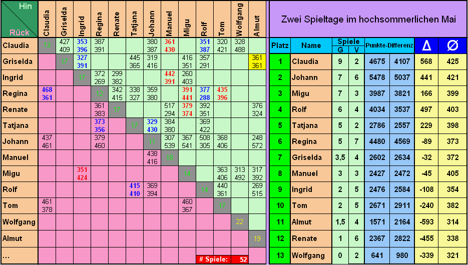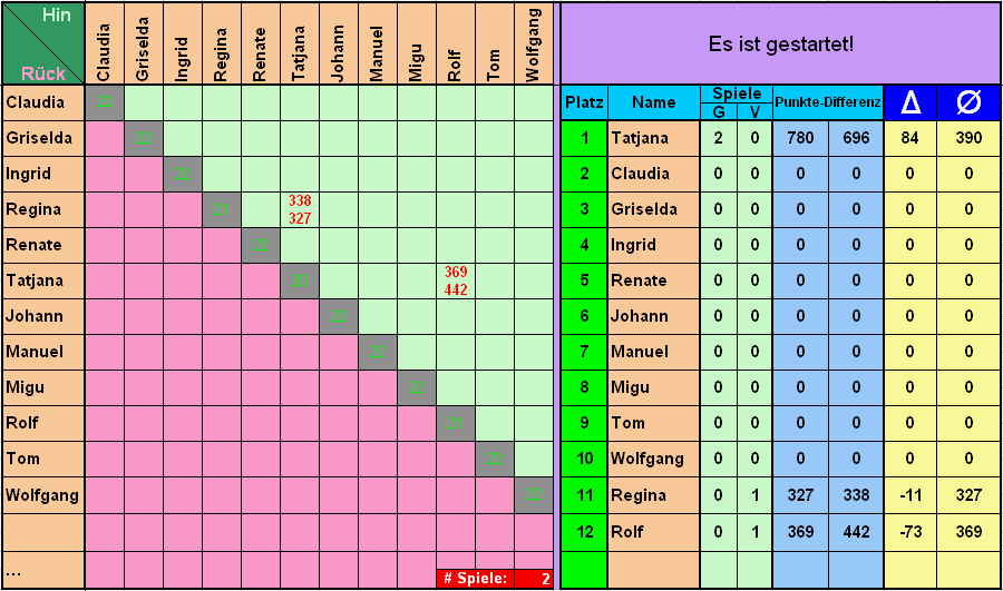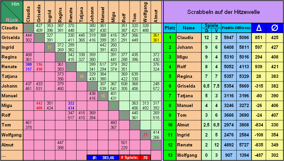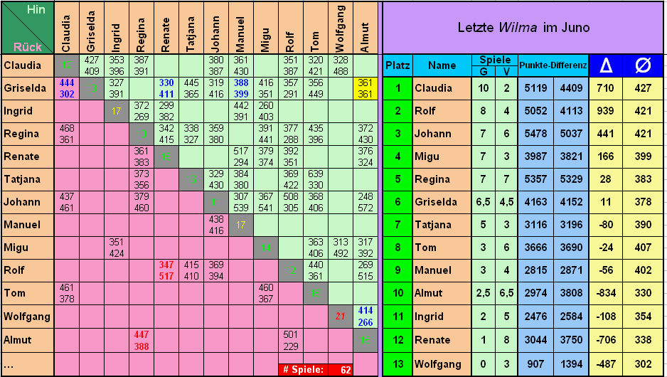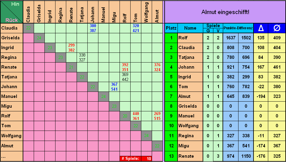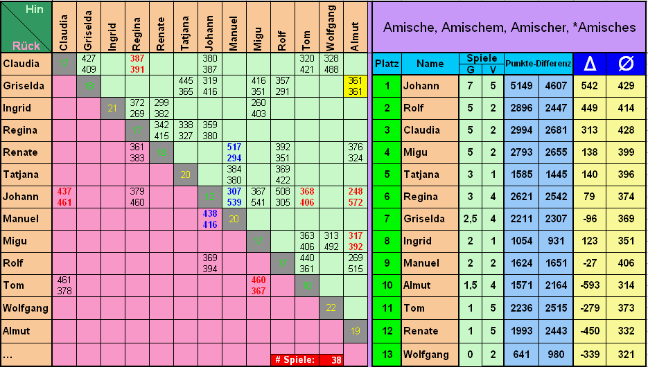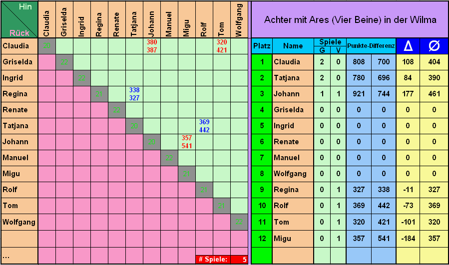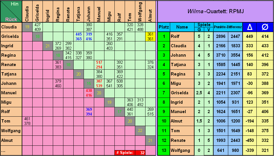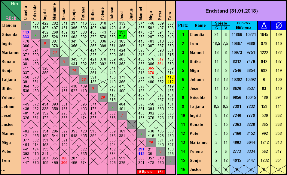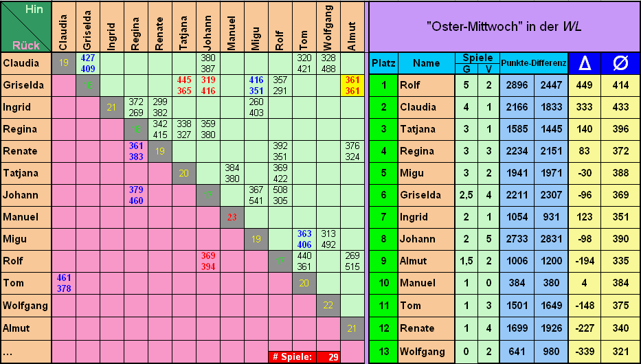 | Hinweise zum Lesen der Ergebnistabelle: Die Hinrunde ist im rechten oberen Teil der Tabelle abgebildet, die Rückrunde im linken unteren (rosa Hintergrund). Der obere Punktwert in einem Ergebnisfeld entspricht dem Spielernamen auf der Waagerechten(Abszisse), der untere dem Spielernamen auf der Senkrechten (Ordinate). Beispiel: In der Hinrunde gewann Claudia gegen Johann mit 387:380 Punkten. Die Ergebnisse der letzten Runde sind rot, jene der vorletzten blau eingefärbt. | ||